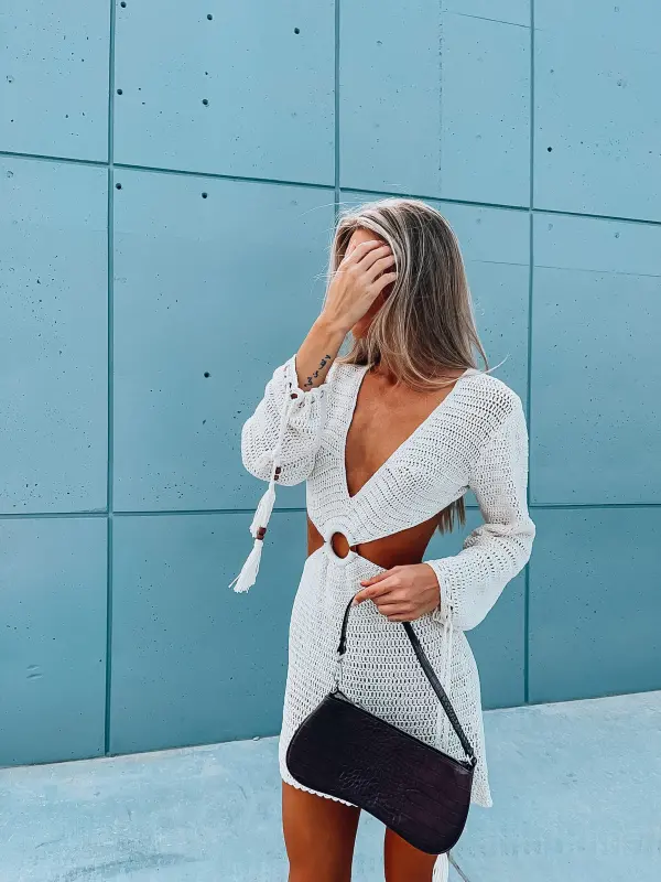 Features: Fitted knit dress, crochet eyelet, cut out in the bodice, long sleeves, open back, fitted silhouette