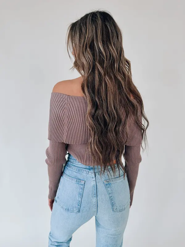 Our Brooks OTS Knit Top is an off the shoulder ribbed knit top with a unique folded neckline. This full length knit top features large fold along the entire neckline which gives it a very stated look. The material of this top is thick and structured and has a lot of stretch throughout.