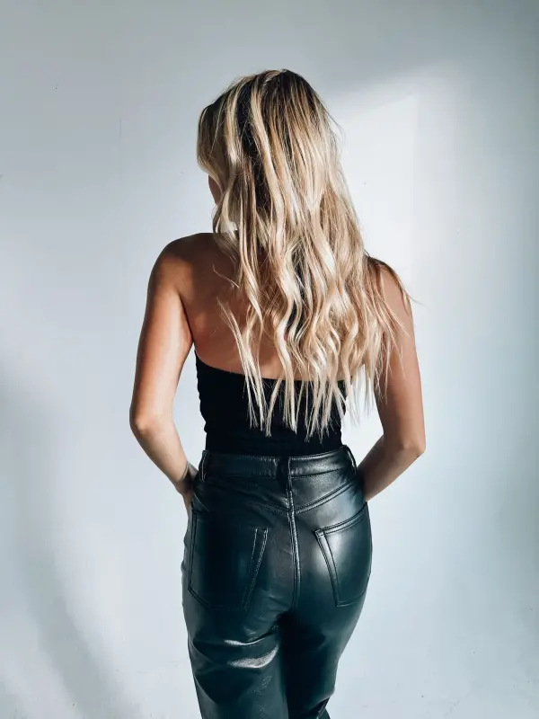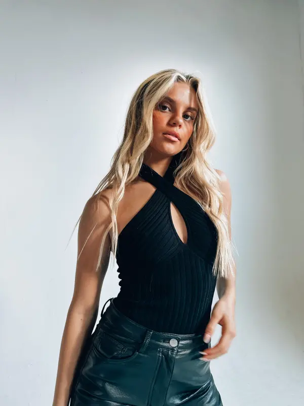 Our Evie Ribbed Halter Bodysuit has a soft to the touch ribbed fabric that is form fitted to the body. This bodysuit has a cross halter detail that has a self tie around the neck. On the front you will see a small keyhole to give it a cute detail. The bodysuit has a “thong” like bottom with a snap button closure. This is the perfect bodysuit to have in your closet!