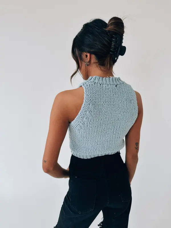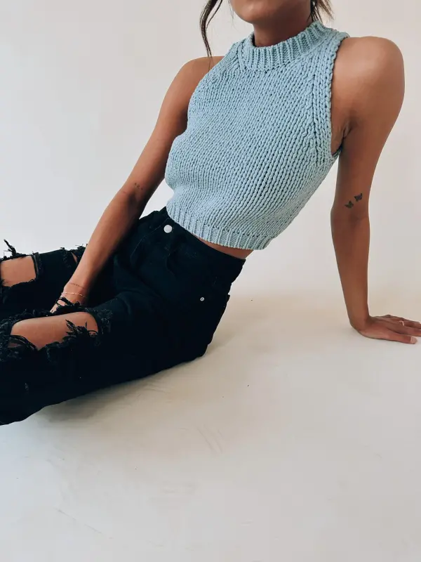 Our Kaelie Sleeveless Knit Top in Blue is a sleeveless cable knit top with a cropped fit. The texture of this top gives it a very unique look. This top is a made of a thick cable knit material with stretch throughout for a comfortable fit. This top is true to size