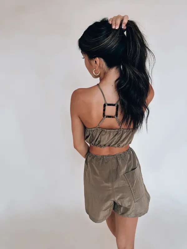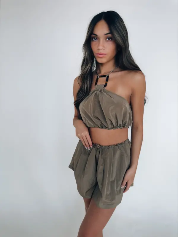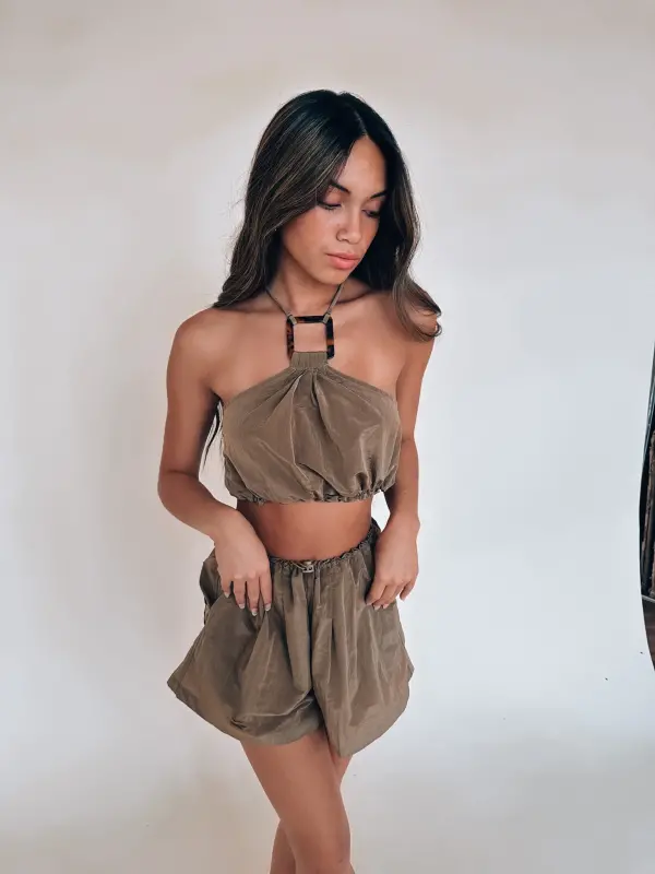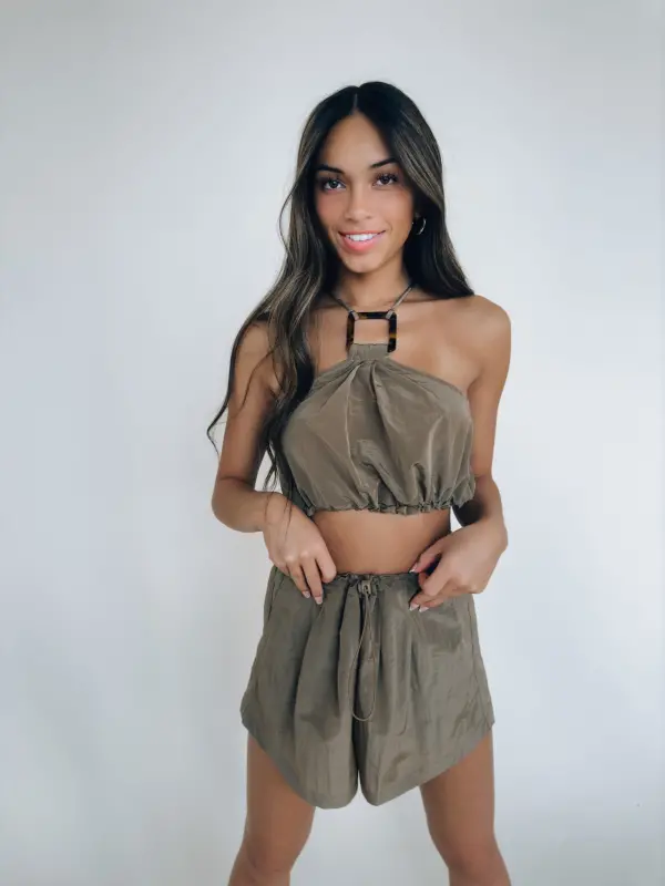 Our Linzie Vacay Set is made out of a windbreaker material that features a halter top and relaxed fit shorts. The top of the set features square tortoise accesories in the front and back that the adjustable halter straps connect too. The top has an elastic waistband with an adjustable drawstring on the side. The shorts feature an elastic waistband with an adjustable drawstring, functional front pockets, and one functional open on the back right side. This set is not lined and has stretch.
