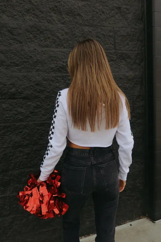 Our Nebraska Racing Crop Hoodie is a fleece lined hoodie with a boxy fit. This sweatshirt features an oversized festive “Nebraska” graphic on the front that makes it perfect for Gamedays in Nebraska. This white sweatshirt is completed with a cropped fit, raw hemline, and long sleeves with checkered detailing down the sleeves . This sweatshirt runs true to size but if a more oversized fit is desired we recommend sizing up.