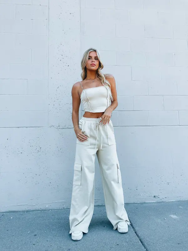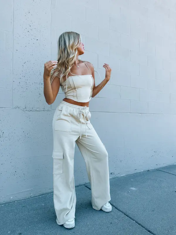 Our Noah Cargo Sweatpants are a comfy bottom that wil take your comfy and casual look to the next level! These super trendy sweatpants feature elastic waistband with drawstring detail to provide a customizable fit. These pants are completed with functional cargo pockets throughout the legs. These taupe sweatpants are lightweight and perfect for any season and they pair perfectly with our noah corset top. These pants are true to size