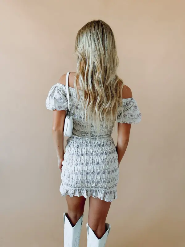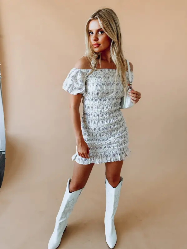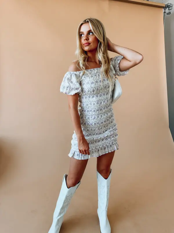 Features: Mini dress, off the shoulder puff sleeves with elastic hemline , smocking detail throughout, fitted silhouette